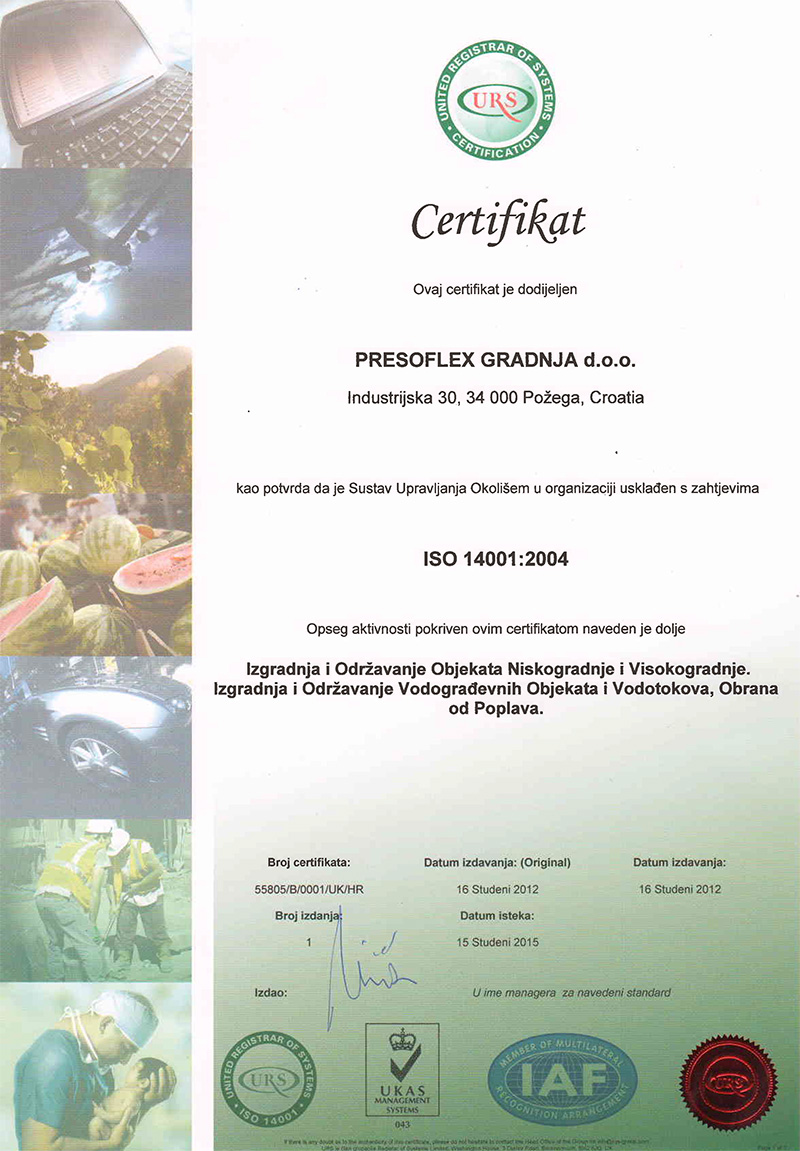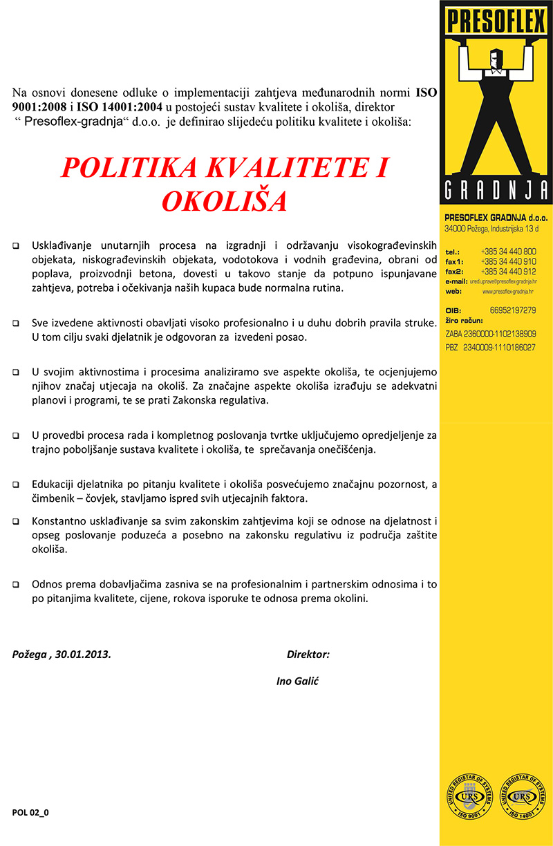 Politika upravljanja kvalitetom i okolišem poduzeća Presoflex gradnja d.o.o. sastavni je dio poslovne politike sa svrhom da kupac dobije proizvode i usluge koji u potpunosti zadovoljavaju njegove zahtjeve. Zahtjevi kupca nastoje se provesti uz što manje štetnih utjecaja na okoliš i uz neprekidno poboljšavanje djelotvornosti sustava upravljanja kvalitetom i okolišem.